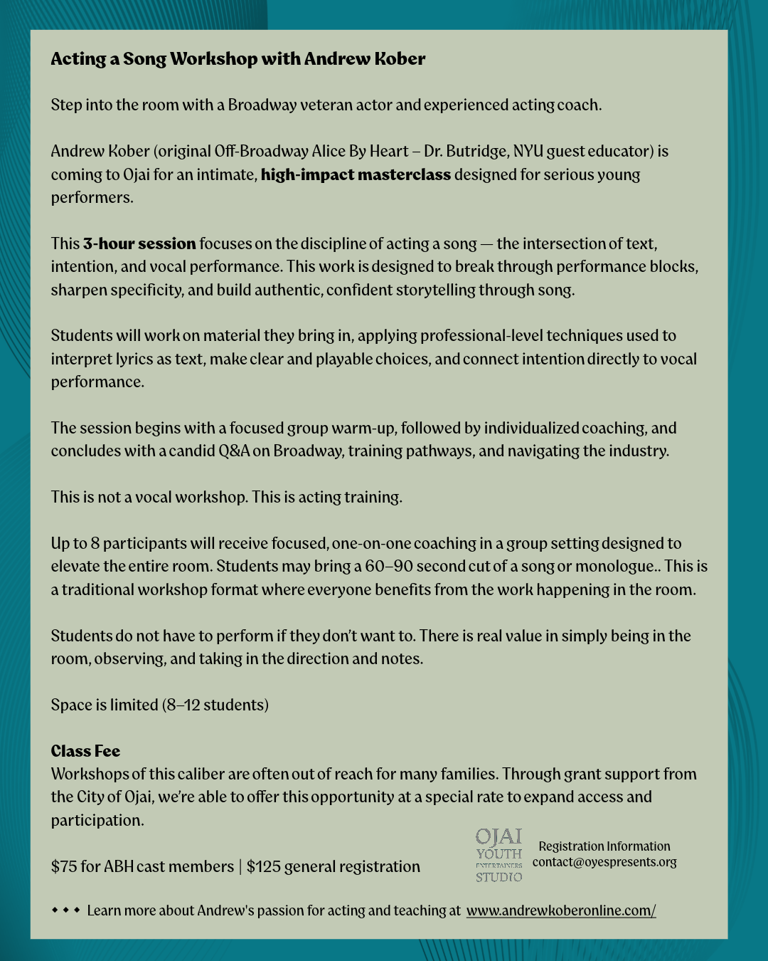 Class rehearsals held at 414 E. Ojai Avenue, Ojai, CA 39023