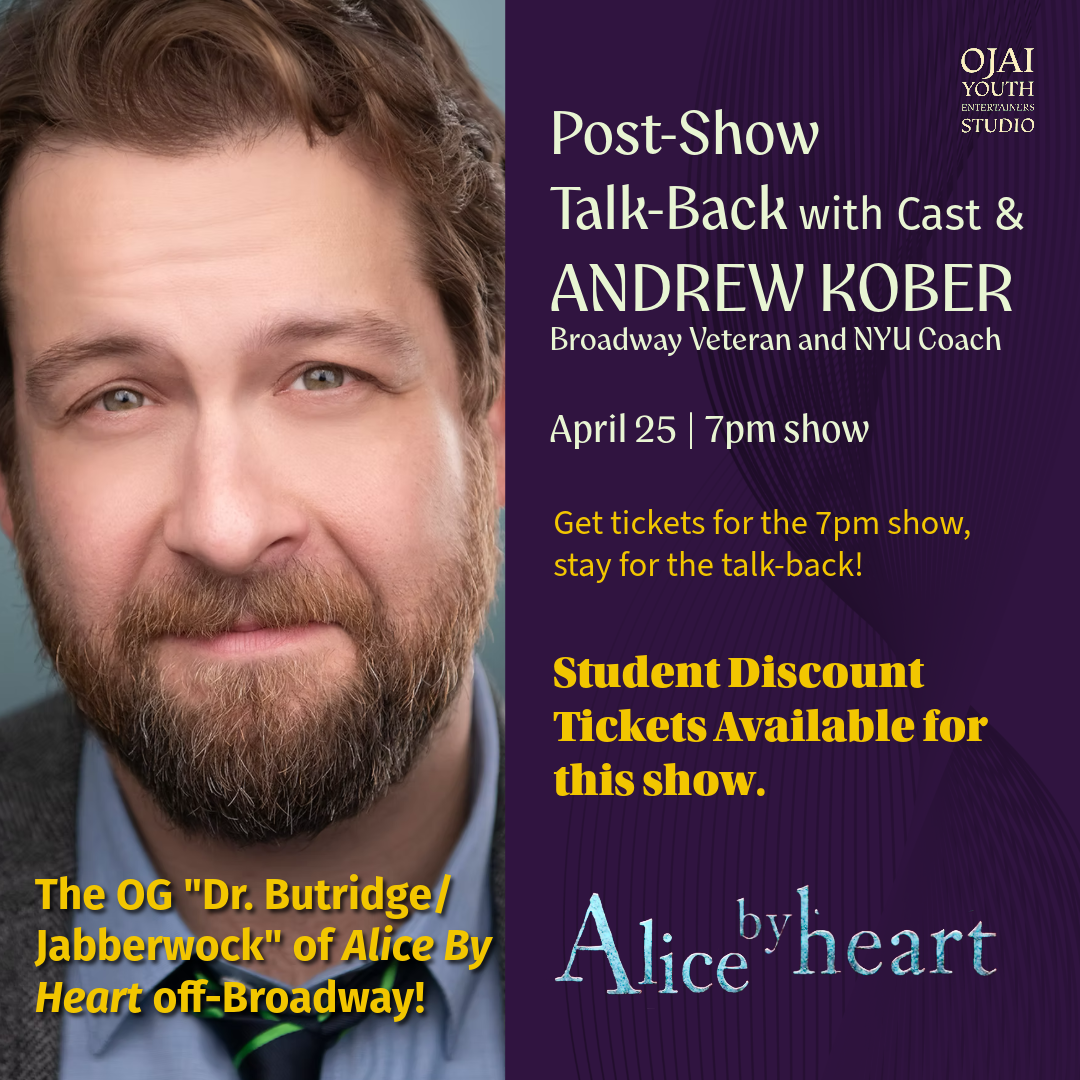 On Saturday, April 25 at 7pm, Broadway veteran Andrew Kober, who originated the role of Dr. Butridge / Jabberwock in the original Off-Broadway production, will join for a post-show conversation with the students and the audience. Andrew has appeared on Broadway in recent revivals of Hair, Les Miserable, and She Loves Me!